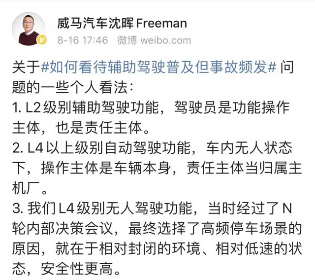 而另一方面,由此引发了对自动驾驶深层次的讨论。这包括自动驾驶的技术路线,智能驾驶的事故责任划分。这也引发了新兴造车企业大佬纷纷表态,威马汽车创始人沈晖针对责任主体的表态是:1. L2级别辅助驾驶功能,驾驶员是功能操作主体,也是责任主体。2. L4以上级别自动驾驶功能,车内无人状态下,操作主体是车辆本身,责任主体当归属主机厂。3. 威马L4级别无人驾驶功能,当时经过了N轮内部决策会议,最终选择了高频停车场景的原因,就在于相对封闭的环境、相对低速的状态,安全性更高。