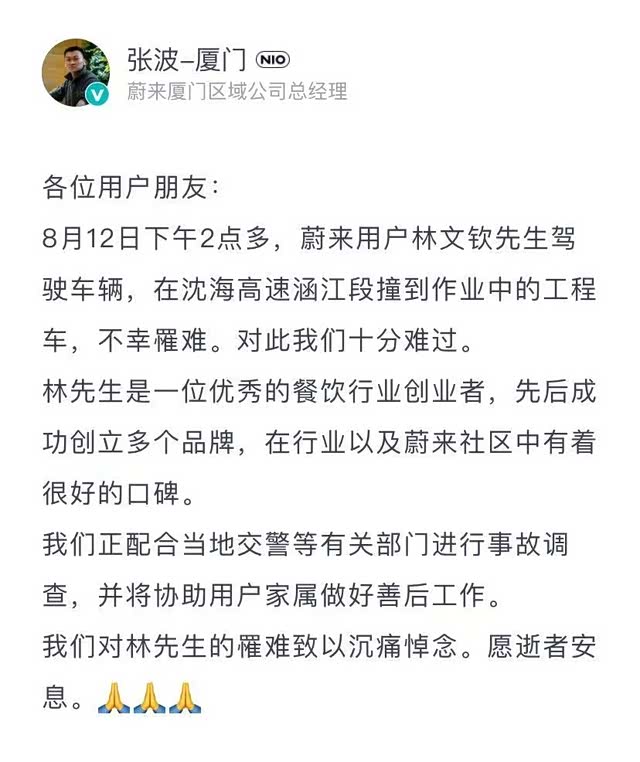 8月14日晚,一个名为“美一好”的个人公众号发布讣告。当天深夜,蔚来厦门区域公司总经理张波在蔚来APP上发文简述了事件,并表示蔚来正在配合当地交警等有关部门进行事故调查,并将协助用户家属做好善后工作。蔚来创始人、董事长兼CEO李斌及蔚来联合创始人兼总裁秦力洪也均对逝者表示哀悼,并强调会配合交警部门调查事故。