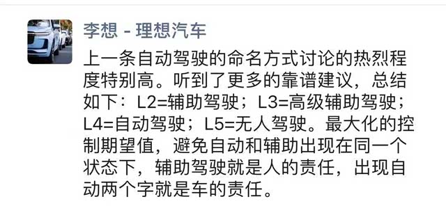 8月16日, 理想汽车创始人李想在社交媒体发文,呼吁媒体和行业机构统一自动驾驶的中文名词的标准,避免夸张的宣传造成用户使用的误解。