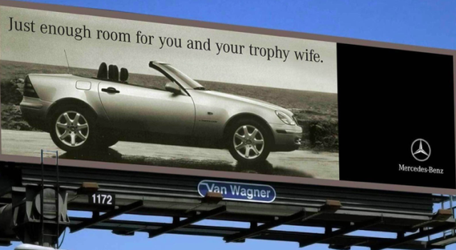 奔驰汽车也有为自己逼格打广告的一天?是的你没看错。早先奔驰曾经推出了一款SLK轿跑车型,该车型与以往的高端大气上档次的奔驰汽车有所不同,无论是从各个角度进行衡量,都无法让人们感觉到它的逼格。于是奔驰剑走偏锋,决定在广告方面下功夫,为了营造车辆的高端逼格,奔驰在广告牌上刊登了这样一句话:“这部小车的空间足够你和你那攀附高枝的妻子乘坐。”这句广告语如果放在今天那绝对是被炮轰的对象,但在当时,这句话却让不少人们对于买这款车的车主有了财大气粗的感觉,不得不说这也是一波相当漂亮的营销。