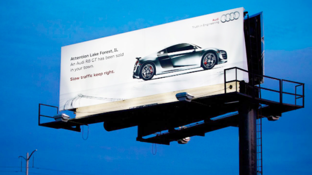 奥迪是全世界范围内的豪华车领军品牌,不仅在行政车型上建树颇丰,性能车层面也有着不错的表现。奥迪R8作为奥迪旗下的超级跑车,其上市自然要进行着重宣传。奥迪官方便曾在芝加哥地区投放过一块广告牌:“本地居民请注意,你们市已有人买走了R8GT,上路请靠右行。”这句广告语的意思非常明显,那就是这款R8 GT就是当地最快的车,其他车子见到了都得乖乖让路,非常霸气。
