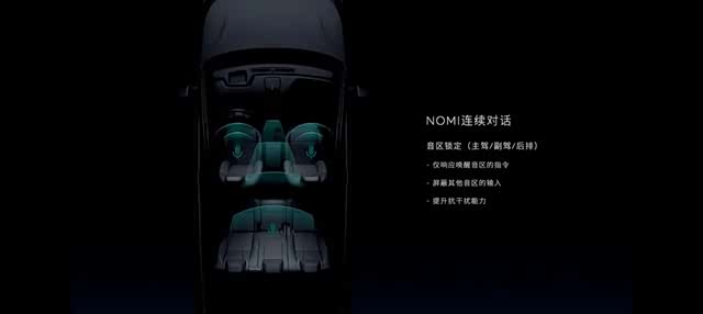 在多音区识别交互方面,为确保车内有多名乘客对话场景下 NOMI 的对话体验,在连续对话开启时将同时默认开启音区锁定。音区锁定功能可使 NOMI 在一次唤醒后只响应来自唤醒音区的指令。如果其他位置乘客在音区锁定状态下希望和 NOMI 交流,需要在重新唤醒 NOMI 后开启新一轮对话。