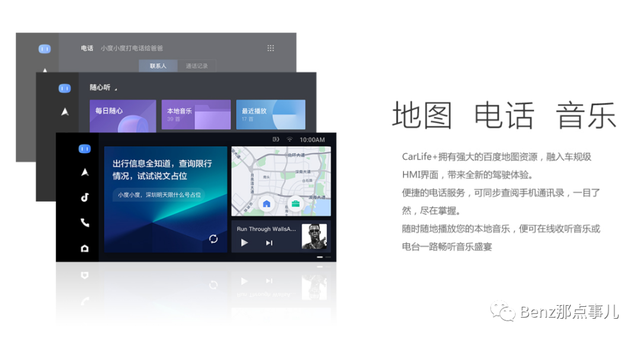 主要功能:语音输入、智能播报、车规级HMI界面设计、连接汽车数据,高精导航 、播放本地音乐、在线收听音乐或电台、支持第三方服务接入、拨打电话、接听来电、同步查阅手机通讯录、查看通话记录。