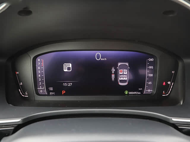 大家都很喜欢的液晶仪表盘首次出现在思域上,个别入门车型为7英寸,其余均为10.25英寸全液晶显示。界面很有特色,两侧为竖立的转速和时速表,中央采用了图标和数字显示,信息交互直接很多。驾驶辅助开启时,中央会有立体的车辆及周边信息显示,很便利。UI风格还有传统的双圆盘可选。
