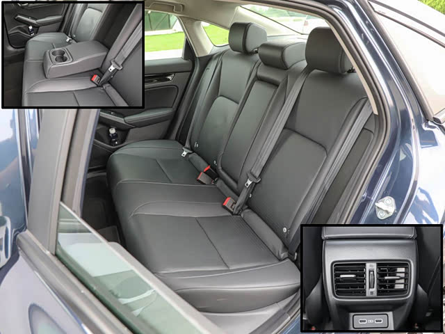 后排座椅材质与前排相同,坐垫和靠背也都加入了打孔处理,坐垫的长度足够能提供不错的腿部支撑力,靠背比较平整,基本没有侧向支撑。空间方面,侃弟身高175cm,腿部空间为一拳三指,头顶也有三指,比起上代车型有一定的提升,对于家庭用户而言要实用很多。配置方面,后排终于提供了中央头枕,虽然不能调节,但总比上代没有要好很多,还有地台式出风口、两个USB插口和带两个水杯架的翻折扶手。