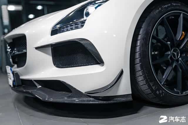 最为显著的便是整车碳纤维套件的加持。细看之下,为了迎合各个碳纤维组件,SLS AMG Black Series的前保险杠亦会与普通版本有所不同。大灯组下的碳纤维扰流翼片、我们俗称的碳纤维风刀以及那尺寸可观的碳纤维前唇,视觉重心更低、视觉感受更犀利,Black Series YYDS!
