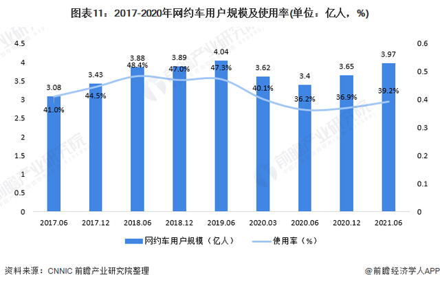 根据中国互联网络信息中心(CNNIC)的统计,截至到2020年底,我国网约车用户规模为3.65亿,较2020年上半年增加0.25亿,占网民整体的36.9%。截至2021年6月,我国网约车用户规模达3.97亿,较2020年12月增长3123万,占网民整体的39.2%。