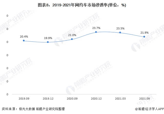 1、市场渗透率:截至2021年第三季度网约车市场渗透率为21.9%