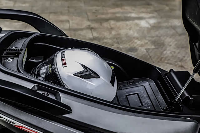 除此之外,这款车也配备了超车灯、应急警示灯,尊享版还有背光手把、无钥匙启动。当然,长途骑行时经常用的USB接口也有配备,免去了后期改装的烦恼。储物方面,座下储物空间可以轻松容纳一顶头盔,单人骑行的话,不用再加装尾箱。