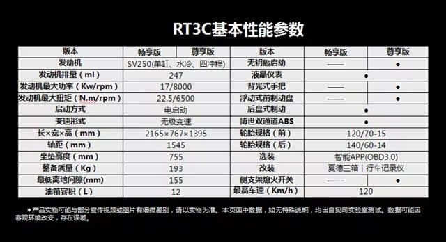 赛科龙RT3C一共上市了两个版本,其中畅享版官方售价为22500元,尊享版官方售价23999元。两个版本主要区别就是尊享版增加了无钥匙启动,浮动式刹车盘、边撑熄火、背光手把开关,其余配置均相同,没有太大差别。