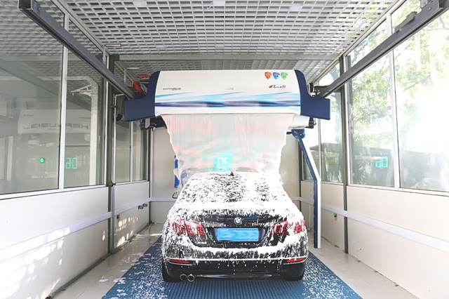 不过现在有一种无接触式自动洗车机,洗车过程中车辆不用动,机器会绕着车身喷洒清洗剂然后用高压水冲掉污渍,整个过程都不触碰车身,这种设备用起来相对简单一些,也不用担心有什么危险。