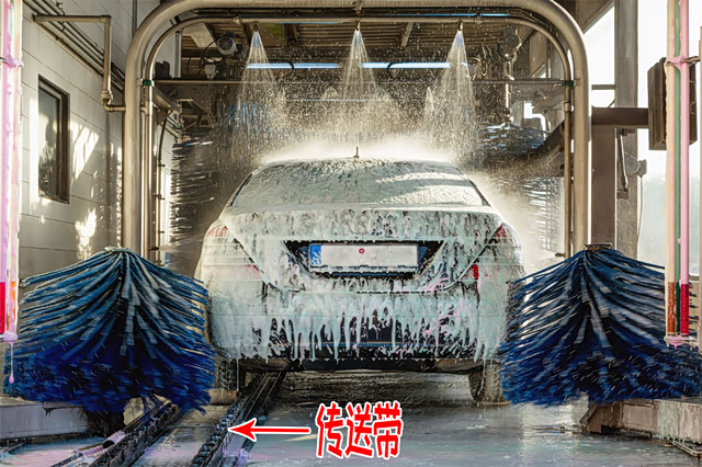 道理还是一样的,因为左侧车轮在传送带上右侧车轮在地面,如果你打方向的话右侧车轮就会使车身向右移动,容易撞到洗车设备。