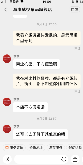 聊聊我亲身经历,我刚接触记录仪是在2015年,之前因为不懂记录仪,在网上看商家销量,哪个销量高买哪个,跟随大众来选择,当时买的印象中是600多,感觉性价比不错,采用的MTK芯片,搭载安卓系统,推出了记录仪配电子狗,导航,语音控制等功能,但用了半年后就出现问题了,功能一开多用半个小时左右就出现卡顿,死机,后面直接开不了机,寄回去给商家维修,拖了一个月才寄回来,收到后用了几天还是那样就干脆不用了,省心。之后我就开始找其他品牌的记录仪,只找单纯录制功能,当时比较火的是360跟盯盯拍都是支持wifi功能,因为可以连接手机观看视频会方便很多,那段时间我也开始研究芯片、感光这些,对记录仪开始有些了解,后面咨询了360跟盯盯拍客服的产品参数,没有客服知道,描述也是没有详细标出,就只会跟你说像素是多少,拍摄非常清楚,问的太多后面可能把我拉黑了,一直没回复。后面关注到海康威视,原本想咨询一下海康威视客服,客服竟然跟我说这是商业秘密不方便透露,其他品牌硬件详情都有标出来,不知道为什么要隐瞒,海康威视算是国内安防产品的大哥,原本想着这品牌的记录仪性能跟稳定性应该都不错,没想到海康威视品牌客服也是这样,才发现记录仪这行业客服水平比我还低,电子产品就怕客服水平低,如果客服一问三不知,对自家产品还不了解,或者是爱理不理的,产品即使在好我都不想买,买了如果出现问题维修很麻烦。
