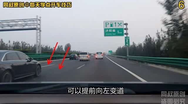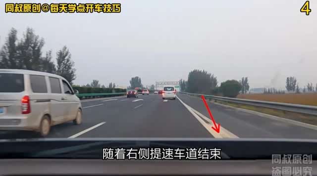 随着右侧提速车道结束,左侧实线也将转换为虚线,需要变道的话,要提前观察左侧后视镜以及左侧车窗外,不要贸然变道。