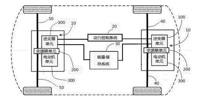 通过蔚来汽车申报的专利图所示纯电动动力总成包括位于前后轴的电驱动系统10、位于车辆底部的动力控制系统20和能量储存系统30。电驱动系统内部集成电动机单元300、变速箱单元200和逆变器100。