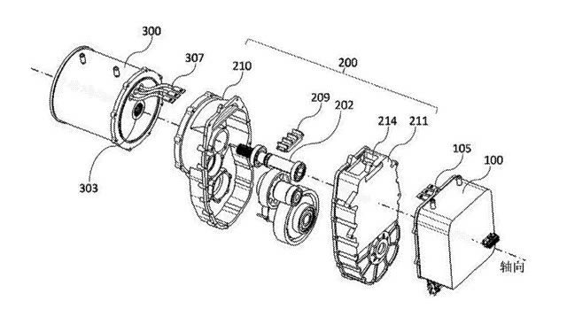 根据蔚来汽车电机总成专利申报图所示电动机单元300、变速箱单元200、逆变器单元100的装配关系爆炸视图。电动机单元、变速箱单元、逆变器单元沿变速箱单元的输入轴202的轴向排布。变速箱单元设有用于穿插电动机单元与逆变器单元的电连接线路的干腔。能将电驱动系统的连接线埋入壳体之内,从而保护电连接线路并使电机总成更加简洁。