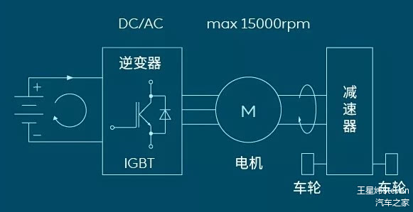 能量储存系统的直流电能,在动力控制系统的功率控制下将直流电转换成交流电提供给电动机单元,电动机单元内的转子在交流电所产生的磁场的作用下旋转,从而将电能转变成机械转动力,通过输出轴将该转动力输出至变速箱单元,变速箱单元通过其内部的各齿轮机构的配合使该转动减速,并经过差速齿轮的调整后,输出至车轮的半轴。