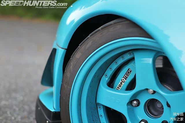 经典款的铝合金锻造轮毂,刹车片采用的是Big Stop Tech刹车,并且喷成蓝色雨车身相呼应。