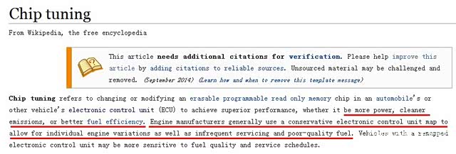 咱们再来看看关于常规ECU调校一词的定义,英文称作“Chip Tuning”: