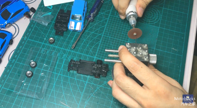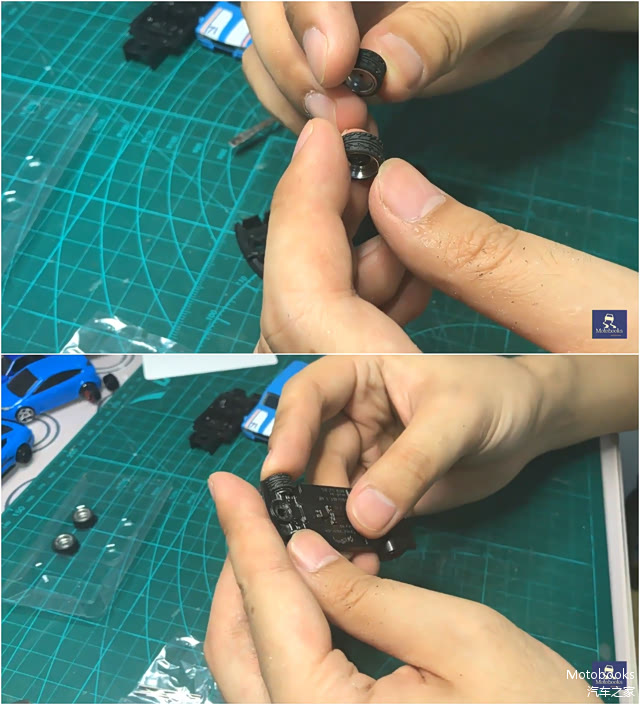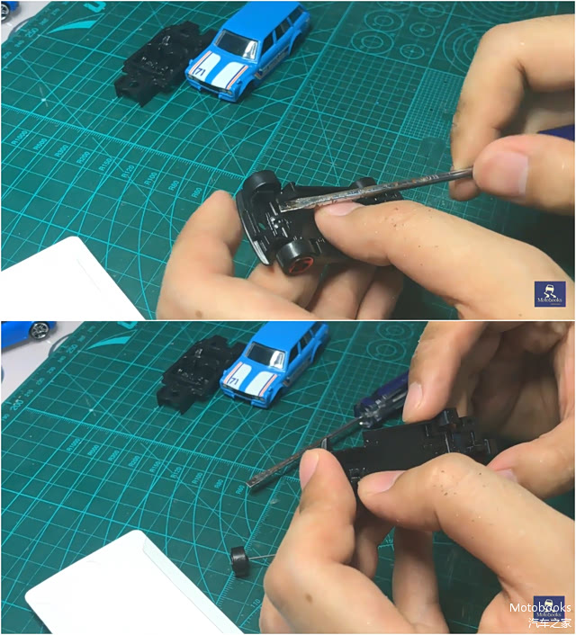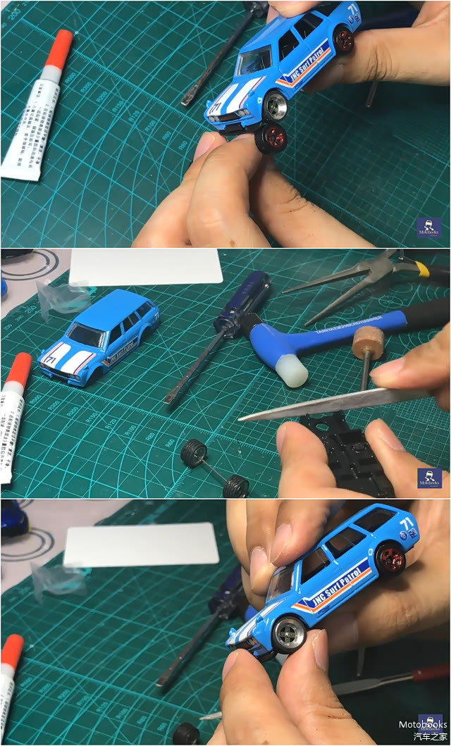值得一提的是,改造轮毂附带的车轴长度一致,但不同车型的风火轮小车底盘却大小不一,这就需要在安装之前进行假组来确定车轴的长度。直接安装倒也不是不可,只是有可能会造成车轴过长,使得把玩的时候影响观感。但要注意的是不要切到太短,否则胶轮蹭到底盘就会造成转动不畅。