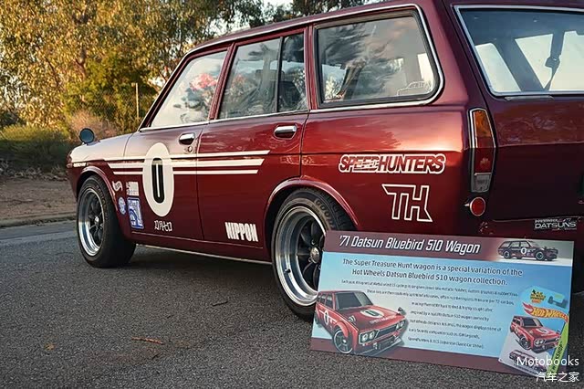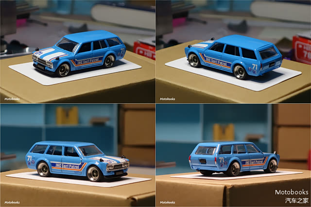 “开刀” 的这台风火轮小车型号为达特桑 1971 Datsun Bluebird 510 Wagon 旅行车,在 Hot Wheels 热辣小车矩阵当中,这台 510 可谓大名鼎鼎!有非常非常多的涂装,多种挂卡以及各种特殊版本,几乎每个风火轮爱好者手里都有。该车最早于 2013 年上市,由风火轮设计师 Jun Imai 设计,亮点是带反光镜细节。