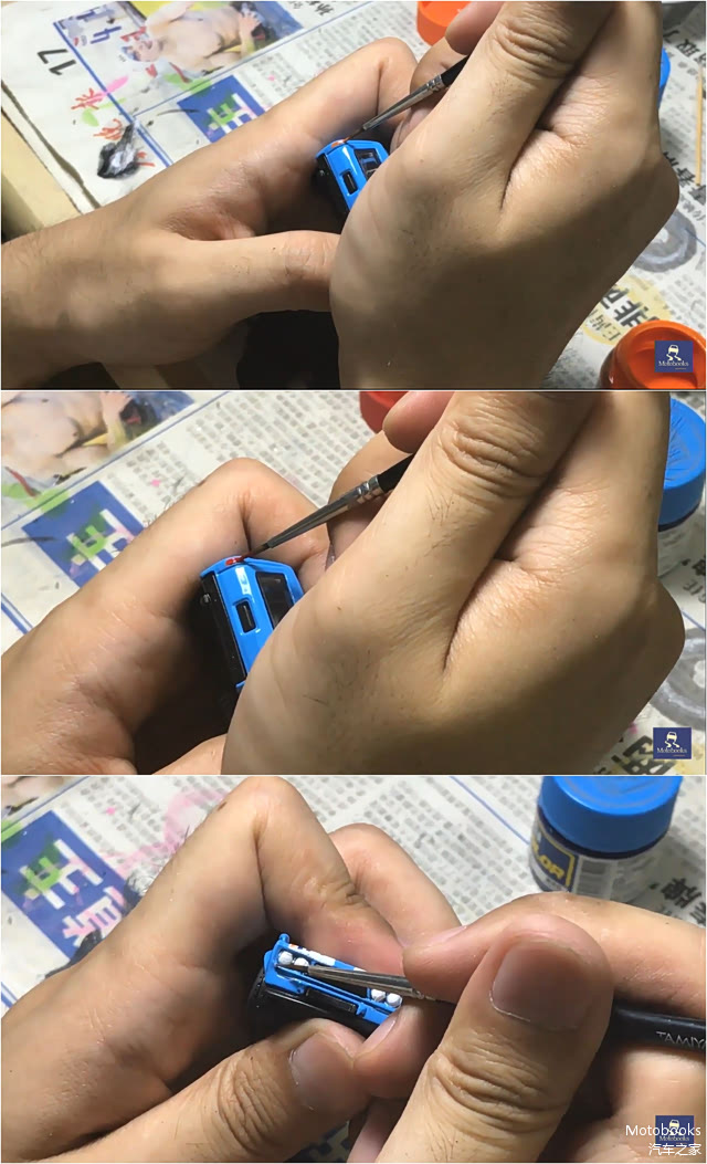 可以在网络上找一些真车的图片进行参考,用各种方式追加涂装的细节。此番我们使用比较入门的笔涂方式,只需要采购相应的常用颜色(比如:红色、黄色等)模型专用油漆和一支好用的毛笔就好。