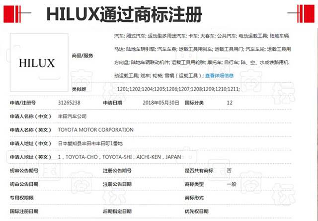 本次丰田汽车对于HILUX商标的注册包括整车以及相关附属的零配件,其中商标类目中的汽车、运动型多用途汽车以及卡车等信息点,让人首先丰田汽车的海拉克斯皮卡。这似乎也暗示着丰田汽车正在为海拉克斯皮卡引进到国内做铺垫。