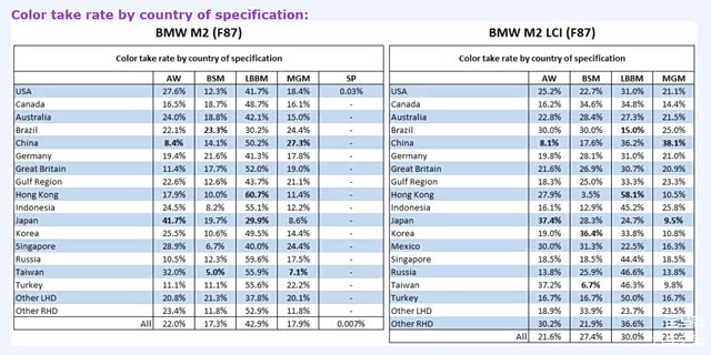 位于北美的美国及加拿大,尤其喜欢MT版本的宝马M2,选择初代F87的比重竟然要高于DCT版本的M2,令人大吃一惊。相对成熟的北美汽车市场,对于驾驶乐趣有要求的车迷还是占比不少的。