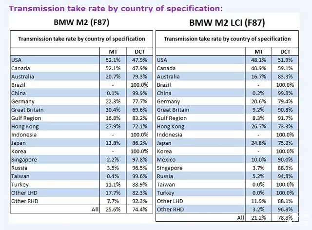 亚洲市场,宝马似乎都不太愿意提供手动版本的M2,韩国、印尼都是100%的DCT变速箱,初代M2在中国市场有0.1%的份额,LCI版本有0.2%的份额,似乎中国市场存在了两三台手挡M2呢,令人艳羡啊。