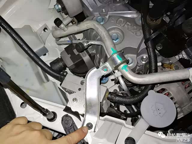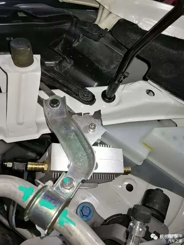 奇骏2.5车型的机舱左侧,大灯总成后方的位置就非常合适固定分离器。松开冷却水管固定支架的螺丝,装上分离器组合支架后利用原厂螺丝同时固定分离器和冷却水管支架。