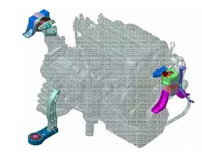 最简单的例子,发动机机脚的阻尼件链接着发动机和变速箱,用橡胶将发动机侧和车身侧的支架连接在一起,构成一个连续弹性结构。