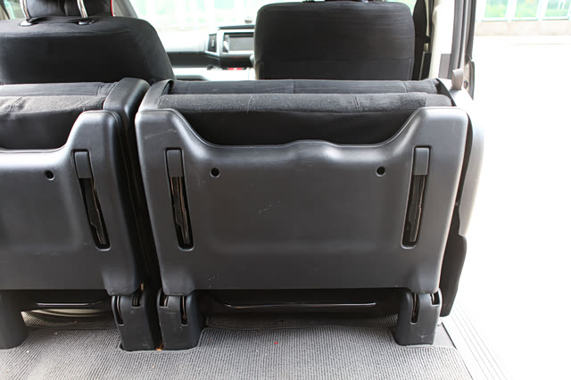 请注意座椅上有一个银色的拉条,当第二排没有人的时候,第三排的人拉动这个拉条,可以起到和扳手一样的效果。第二排瞬间折叠。