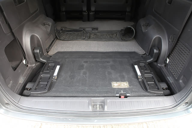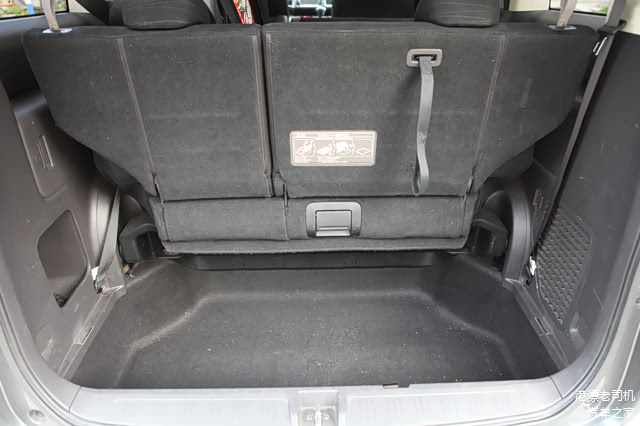 来到车的后部,首先看后备箱的地板有一个凹造型,增大了后备箱面积。其次,第三排座椅折叠后可以缩在里面实现全平地板。