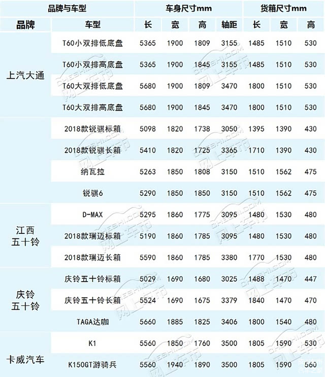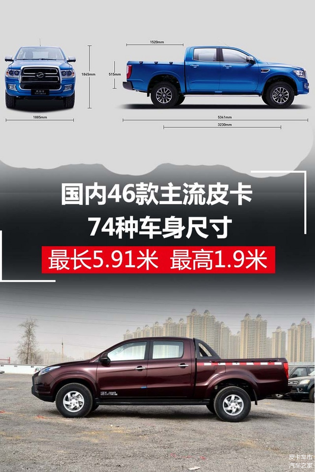 对于选购皮卡车型的用户来说,车身尺寸是必定要考虑的重要因素。今天这篇稿,就是让大家更加透彻的了解国内每一款车型的车身尺寸,以下表格汇总了国内46款主流皮卡车型的74种车身尺寸的具体情况。小编选取了具有明显尺寸特征的车型给大家介绍。