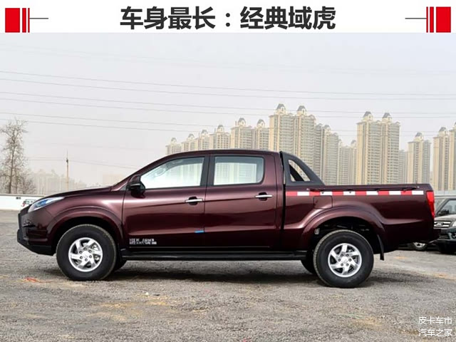 江铃汽车旗下有宝典、全新域虎和经典域虎三款车型,其中宝典和经典域虎具有标轴和长轴车型,全新域虎只有一种车身尺寸。经典域虎长轴车型拥有5765mm的车身长度,为我国国产皮卡车身尺寸长度之最。
