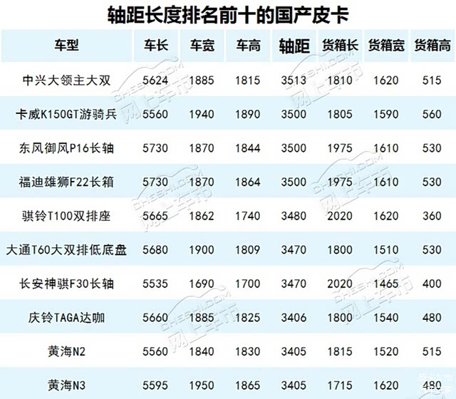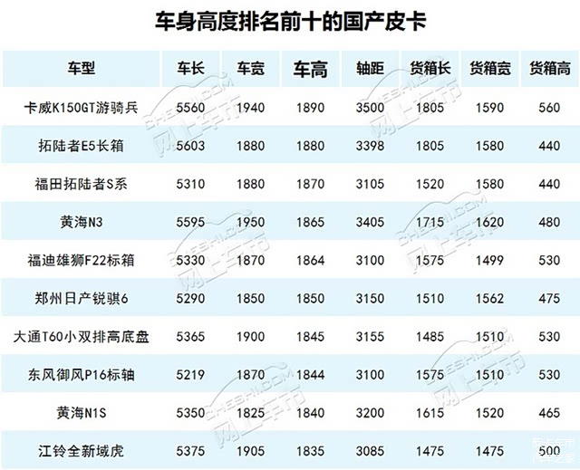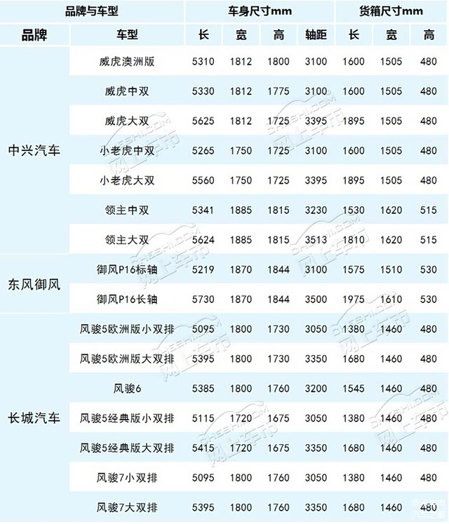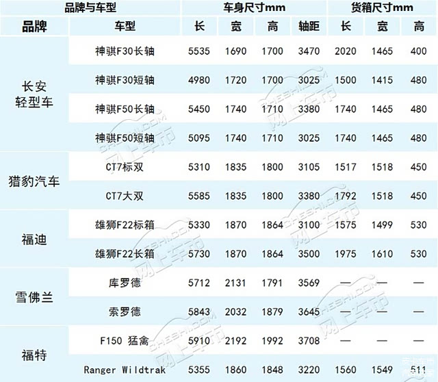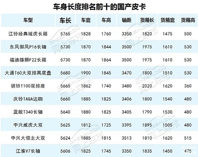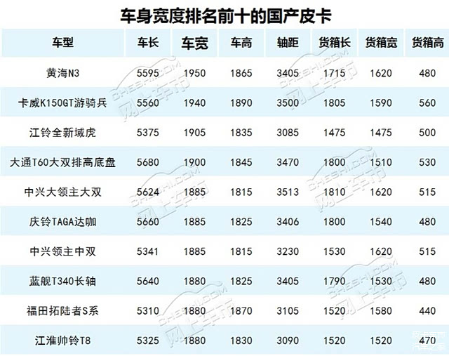 看完以上表格和内容,很多人的心中该有一把尺子了。随着我国皮卡车型的进一步升级,“更长、更宽、更高”的设计理念必将应用在新兴皮卡车型中,各种豪华宽体大皮卡还将不断涌现。届时,用户将有更多购车选择,可拥有更为舒适的驾乘空间。