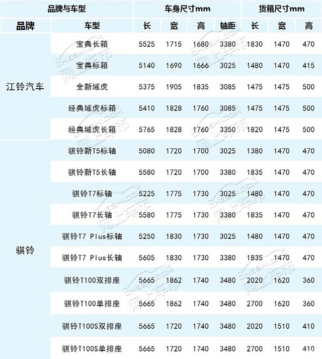 骐铃皮卡车型尺寸最为丰富,包含五款车型,每一款车均有长/短轴,共有10种车身尺寸。其中,骐铃T100单排座皮卡长达2700mm的货箱长度为目前国内在售皮卡车型货箱长度之最。
