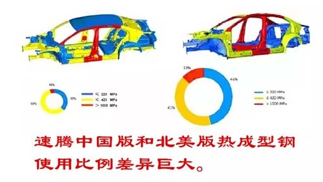 还有一个让人非常气愤的事,那就是有些车企内外有别,在不同的国家使用不同的标准。比如说大众速腾,在美国和加拿大生产的车型和在中国大陆生产的车型使用的热成型钢比例差异巨大。下图为北美版第六代Jetta(也就是新速腾)的和国产新速腾材料分布示意图,其红色区域所表示的便是车身中强度最高的、屈服强度超过1000MPa的"热成型钢",北美版从A柱一直延伸至C柱位置并包含整个B柱,几乎囊括了车辆的整个侧围,甚至包括中央的传动通道也采用了局部的热成型钢材质。在整个白车身中热成型钢的使用率达到了15%;而中国版热成型钢所占用的比例不足10%,底盘中央传动通道和后门框位置的"红色"热成型钢变为"黄色"普通高强度钢,由此一来乘员舱结构发生了一些明显的变化,车身的强度肯定不如北美版的,发生碰撞时中国版更容易变形,对乘员的保护也比较差。难道中国人的命真的不如老美的值钱?