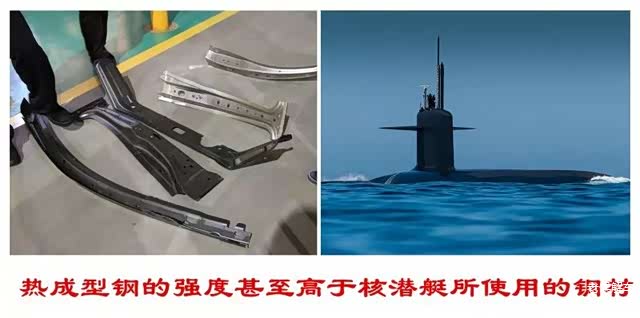 如何理解热成型钢板的强度概念呢?我们来做一个对比。美国海军伯克级导弹驱逐舰使用的结构材料其屈服强度为550MPa级,法国海军“凯旋”级核潜艇耐压壳体所使用钢屈服强度为980MPa级。也就是说,热成型钢板的强度高于战舰和核潜艇所使用的钢材。