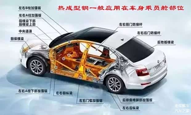 热成型钢一般用在最需要保护的乘员舱位置,比如A、B柱、车门防撞梁、前纵梁、地板横梁、铰链加强板等部位,将乘员舱围成了一个坚固的笼型,极大的提高了车身的抗碰撞能力和整体安全性,在发生碰撞时不易变形,更好的保护车内乘员的安全。
