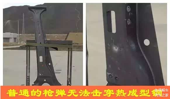 有一个实验,将一台车的B柱加强板所采用的热成型钢板,分别用鲁格10/22运动步枪、64式手枪、92式手枪射击,热成型钢都没有被击穿,只是留下了弹痕。