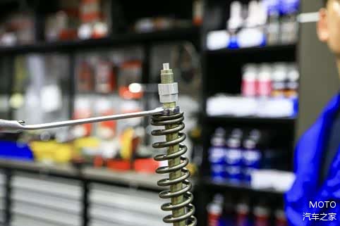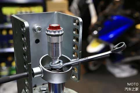 安装时要注意到顶盖与弹簧之间,还要多放一片钢制垫片。顶盖与轴心结合时需要确实用手锁到底,不然弹簧长度会不一样会影响到总长下方使用11mm开口扳手,将轴心上的固定螺帽往上锁紧。