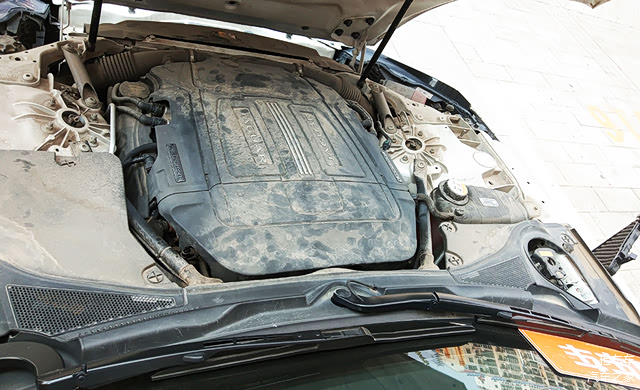 打开发动机舱,3.0T的涡轮发动机,最大马力381马力,460牛米的动力,足够强劲,不过发动机舱实在是太脏了。不过也好,恰好说明没有刻意清理,很多朋友总喜欢擦的一尘不染的发动机,太干净的发动机舱其实更危险。比如气门室漏油的痕迹也随之被清理干净,当场你是根本看不出的。