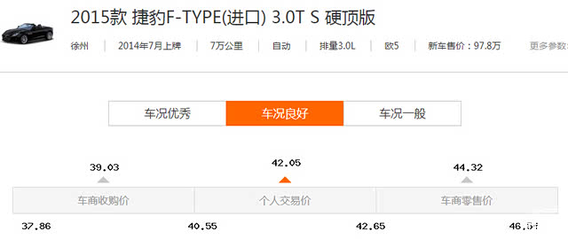 车辆估值,这辆捷豹F-TYPE 3.0T S 硬顶版的正常价在42-44万左右,卖家要43.5万,不算高。而且车子整体车况还不错。还是值得购买的,我把车辆详细检测结果,报给粉丝后就离开,赶往杭州了,杭州还有俩玛莎拉蒂待检测。至于最后成没成交,我就不知道了。好了,今天就先到这里吧,如果您有关于二手车的问题需要帮助,可以在下方留言,我会第一时间给您回复。