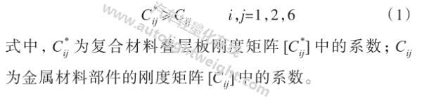 等效刚度设计是在载荷和基本结构不变的前提下,根据已满足承载要求的金属结构件的刚度为目标,设计复合材料的叠层结构和计算其叠层的刚度,将两者的刚度进行比较,应满足: