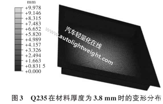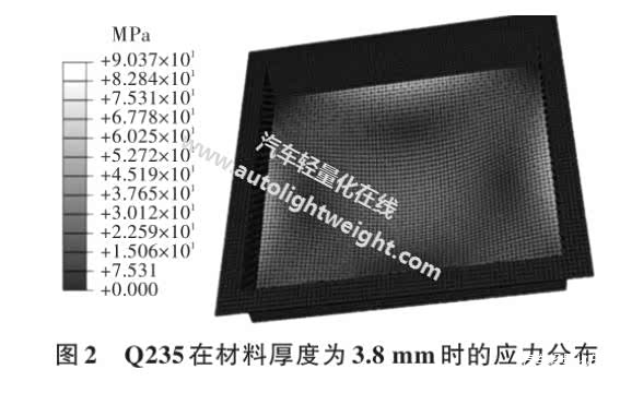 工程设计中对薄板盒体承载结构的强度分析可采用快捷的有限元数值仿真技术。考虑到电池盒所承受的冲击载荷,选择安全系数为2.5,确定其冲击载荷作用下的许用应力[σ]为94MPa,应用ABAQUS数值分析软件,约束方式选择侧面为简支边,选择8节点6面体单元,得到金属电池盒最大应力接近许用应力时的村料厚度为3.8mm。图2所示为应力分布,可以看出,最大应力值为90.37MPa;图3所示为变形分布,可以看出,最大变形为9.978mm。