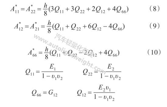 针对所设计的铺层方案,可推导出面内刚度系数A*ij与正轴刚度系数Qij的关系:
