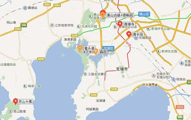 说到打卡无锡,其实一天就足够,通过这张图可见,无锡的网红景点都是扎堆出现的。除了灵山大佛较远以外,像是惠山古镇、南禅寺、南长街、鼋头渚、蠡园等位置都集中在一起,而且可选择的路线很多又不是很繁琐,而我的理念就是随心所欲。