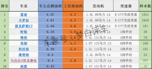 从排名前十的车型可以看出,我们国内最省油的车型还是合资品牌,并且还是日系和德系较为突出。排名前三位的都是日系车,不过他们都是混动型车型,油耗低也是在情理之中的。都说德系和美系的油耗性能不是很出色,甚至说他们是“油老虎”,看来也是比较片面的说法。在前十名当中,德系的斯柯达昕锐位居第四位,大众桑塔纳位居第8位,大众凌渡位居第10位,而美系的别克英朗位居第6位,雪佛兰科沃兹位居第7位。
