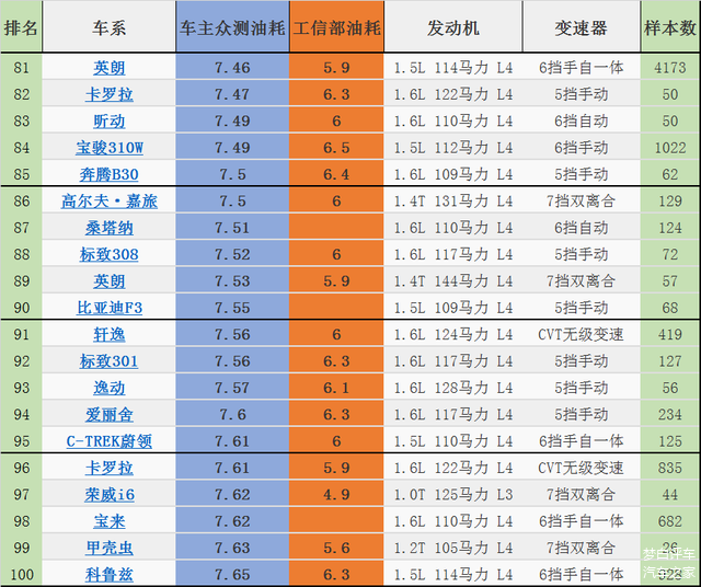 41-60区间,才开始有了我们国产品牌的影子,位居第48位的是荣威360,1.5L的排量,百公里油耗为7.06L,也只能算是一般。还有位居第58位的东风风行景逸S50,同为1.5L的排量,油耗要比荣威360要高出一些。